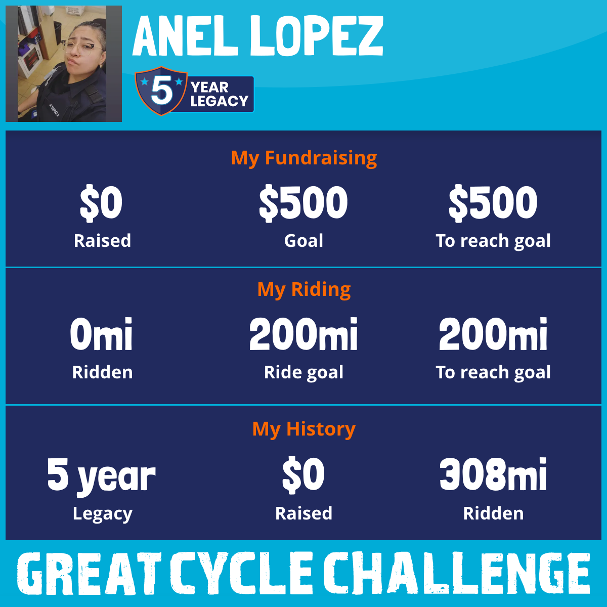 I am riding 200 mi in memory of my myself, Anel. Please sponsor me and support my challenge to fight kids' cancer and save little lives.