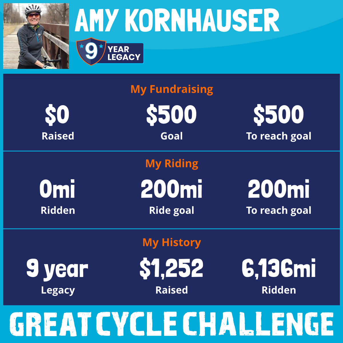 I'm riding in memory of K.C. Kays, our courageous hero from Lebanon. Since 2017, I've ridden over 6,000 miles to support kids' cancer research. Donate now!