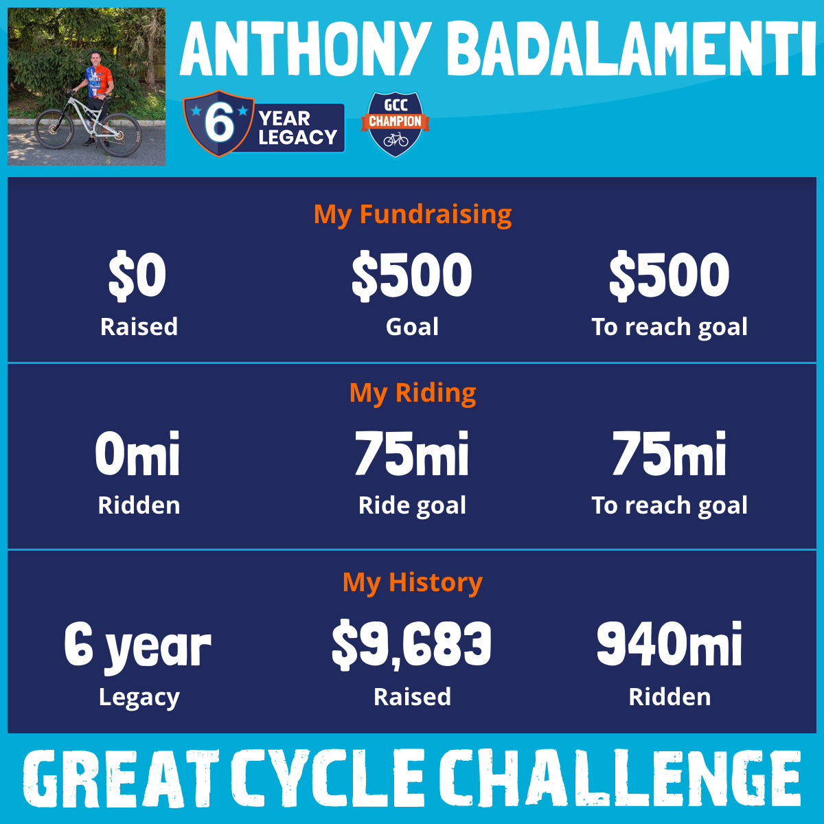 I'm back at it again this year, taking on the Great Cycle Challenge for the 6th time! 💪 This September, I'll be cycling 75 miles to fight childhood cancer. 🎗️ It's a cause that's incredibly close to my heart. ❤️