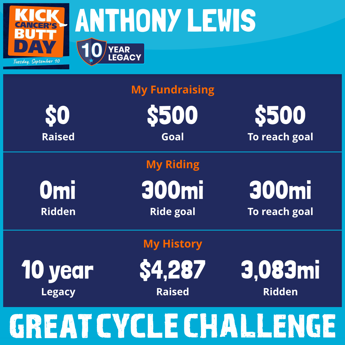 Good evening everyone.This September, I am taking part in the Great Cycle Challenge to fight kids' cancer! This is my 8th year participating in this fundraiser. Wednesday September 13, 2023 is Kick Cancer’s Butt day all online donations will be match up to ($1.5M)