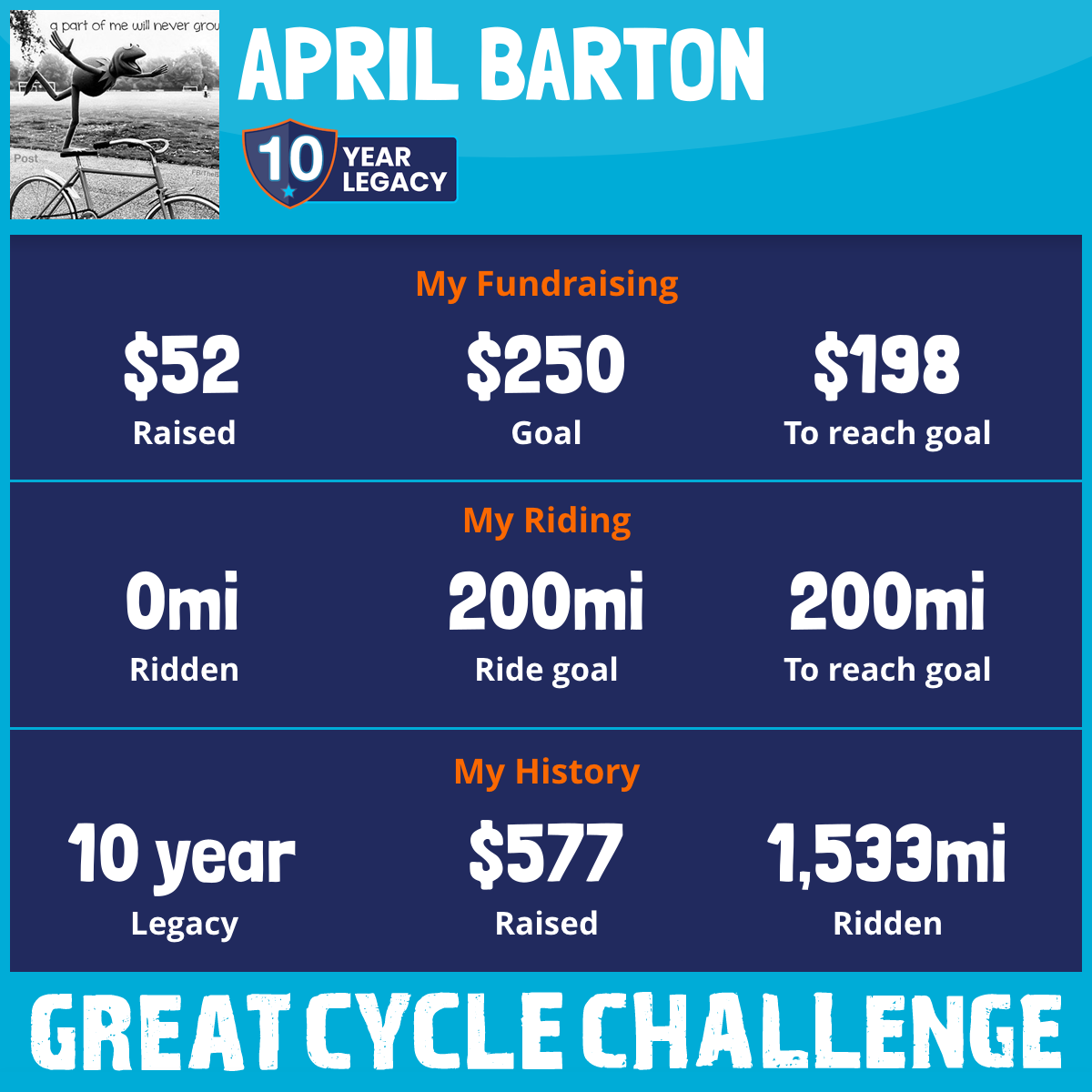 I am riding 200 mi in memory of Lynn. Please sponsor me and support my challenge to fight kids' cancer and save little lives.
