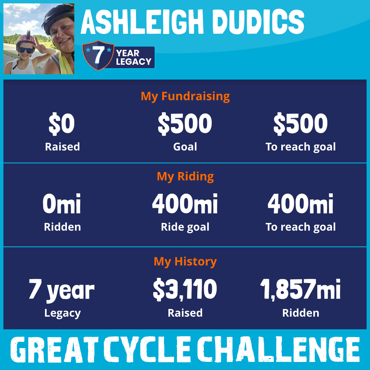 August 29th will mark 19 years since my daughters death. I've donated through out those years in hope. Hope that one more child wouldn't suffer. One more child wouldn't die and so one more family wouldn't have to live through what I lived through. This will be my seventh year riding. In the last 7 years years ive raised over three thousand dollars. This year I've raised my miles in hope that if I do the hard part you'll donate. So in this time of uncertainty if you can, please donate. If you can't please don't feel bad. I'll still ride just share. Thanks for helping me kick cancers butt.