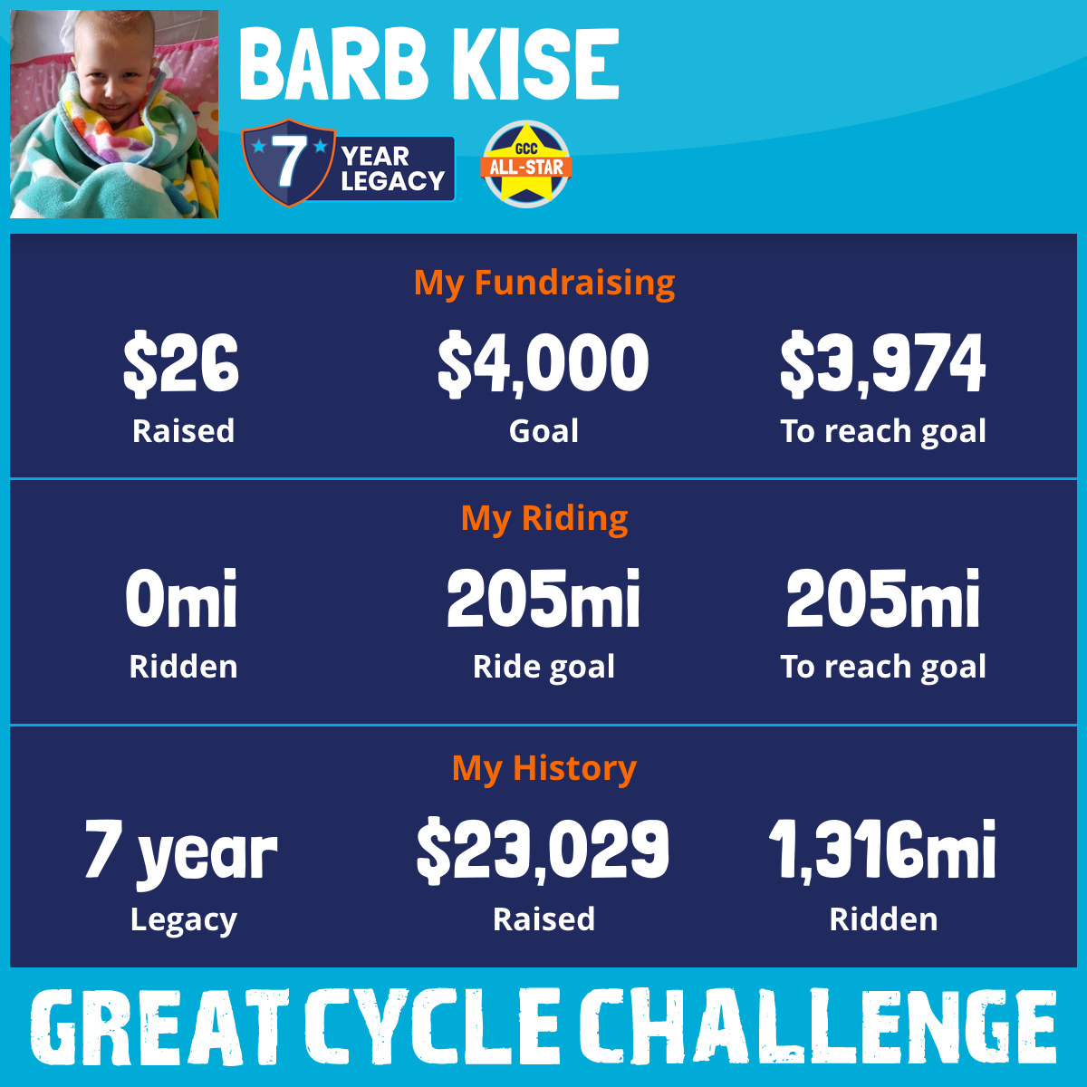Hi, friends. This September, we are riding in the Great Cycle Challenge to fight kids' cancer. Our goal is to pedal 300 miles and raise $5,000.
