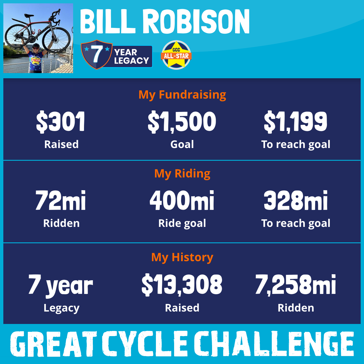My seventh (whew) year riding for this important cause and organization, I will again be peddling throughout the month of September in support of the Great Cycle Challenge to fight kids' cancer. My goal is to pedal 400 miles throughout the month, but I will be trying to beat that. My more important goal is to raise more than $1500 doing it. I am starting my fundraiser later than in past years (September starts tomorrow!), so I have missed out on some fundraising time and set by goal a bit more cautiously, but I feel confident in the support of friends and family to put me over my goal, and who knows - maybe I will still beat last year.