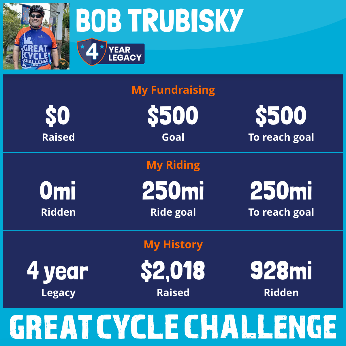 Families struggle when a member comes down with cancer, especially a child. That’s where my best friend John came to me. He knows how passionate I am about biking and he introduced me to the Great Cycling Challenge and asked that I do it on behalf of his daughter Maggies. That I biked 800 miles and raised over $2,000. I am happy to say that Maggie is now a cancer survivor and has just graduated high school. She will be off to college in the fall and has her sight on medical school. Bob