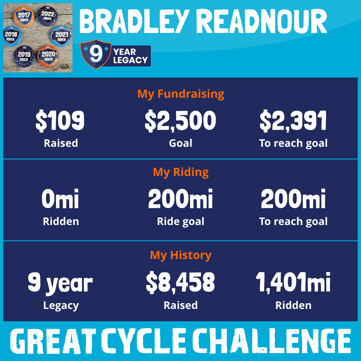This September I am taking part in the Great Cycle Challenge to fight kids' cancer! Last year with your help, we raised $2,783 for this charity. I was also able to overcome my previous year's ankle injury and ride 236 miles! This year I am going to try and ride 300 miles and raise $5,000. I am very thankful for all my supporters do here.