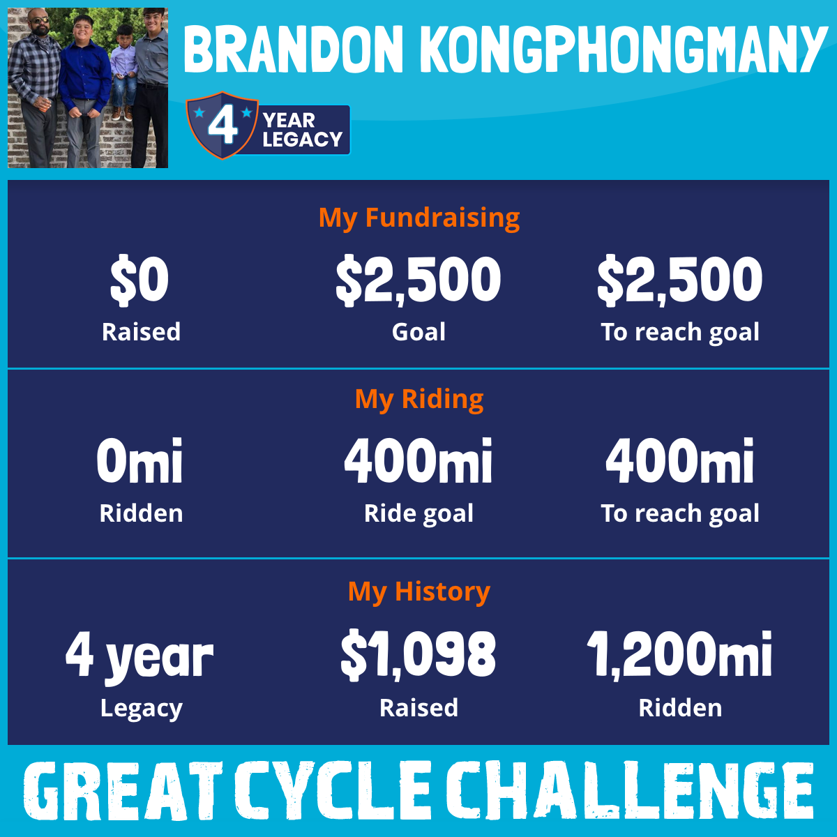 I am riding 400 mi in memory of my cousin, Cainen Sengsourivong. Please sponsor me and support my challenge to fight kids' cancer and save little lives.