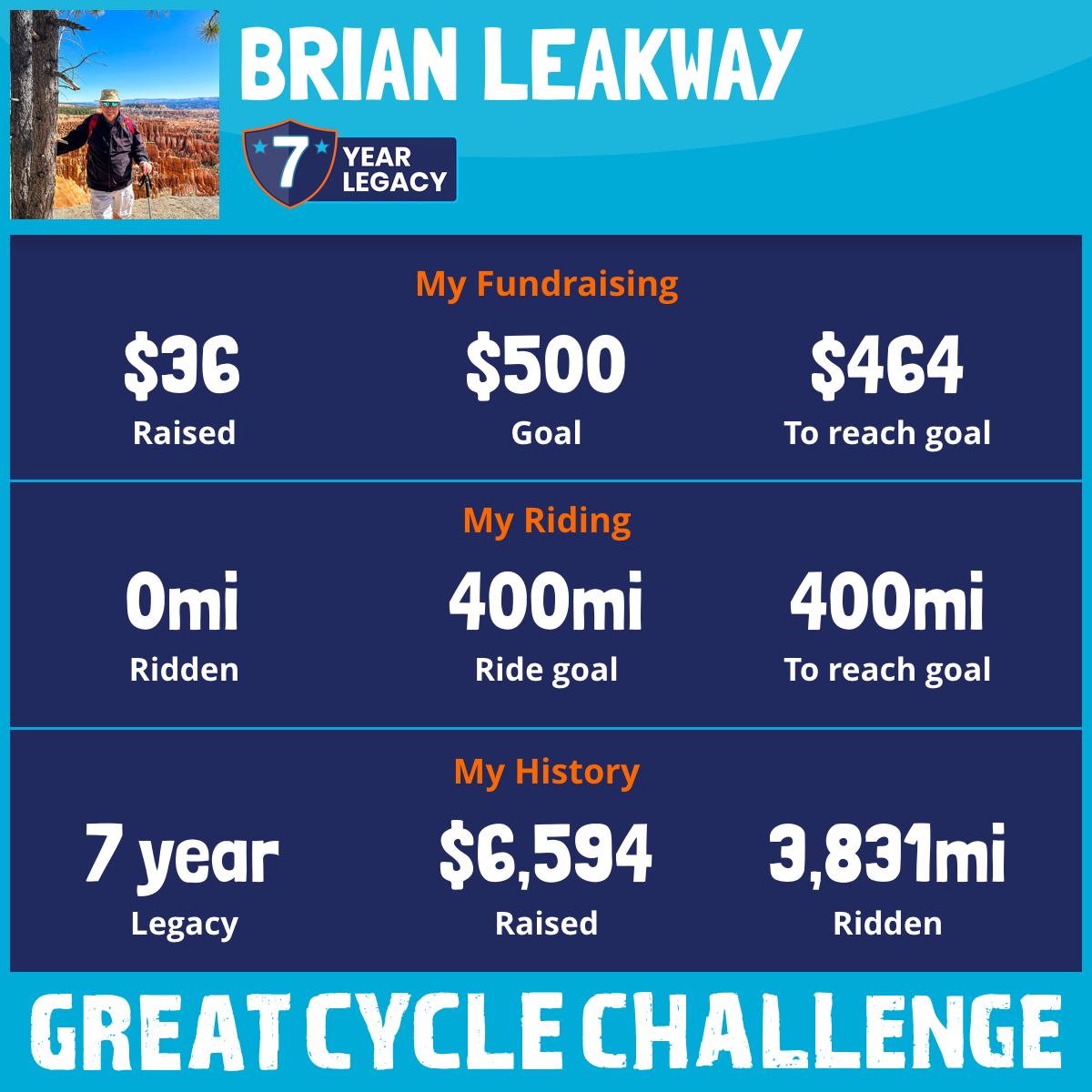 Please support me by making a donation to give these kids the brighter futures they deserve. https://greatcyclechallenge.com/Riders/BrianLeakway