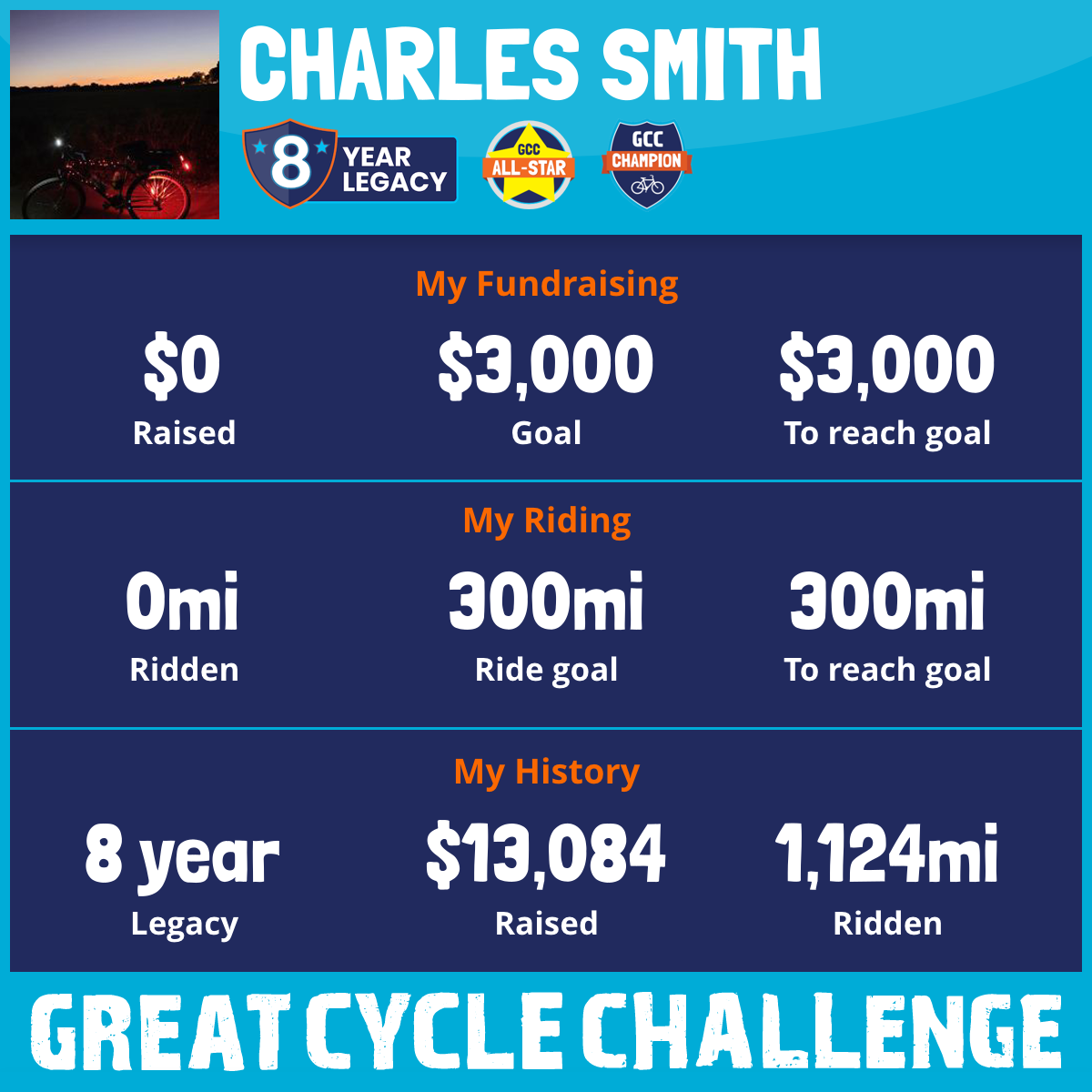 The last 4 years I have failed to hit my 300 mileage and $3000 goal. So that has been adding to my motivation to make up for it this year. I am getting motivated and determined to hit and surpass my goal. So, lets do it and get started to fight childhood cancer!