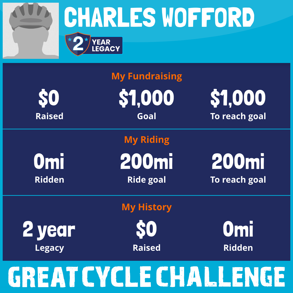 I am riding 200 mi in memory of my dad, Charles Edwatd Wofford. Please sponsor me and support my challenge to fight kids' cancer and save little lives.