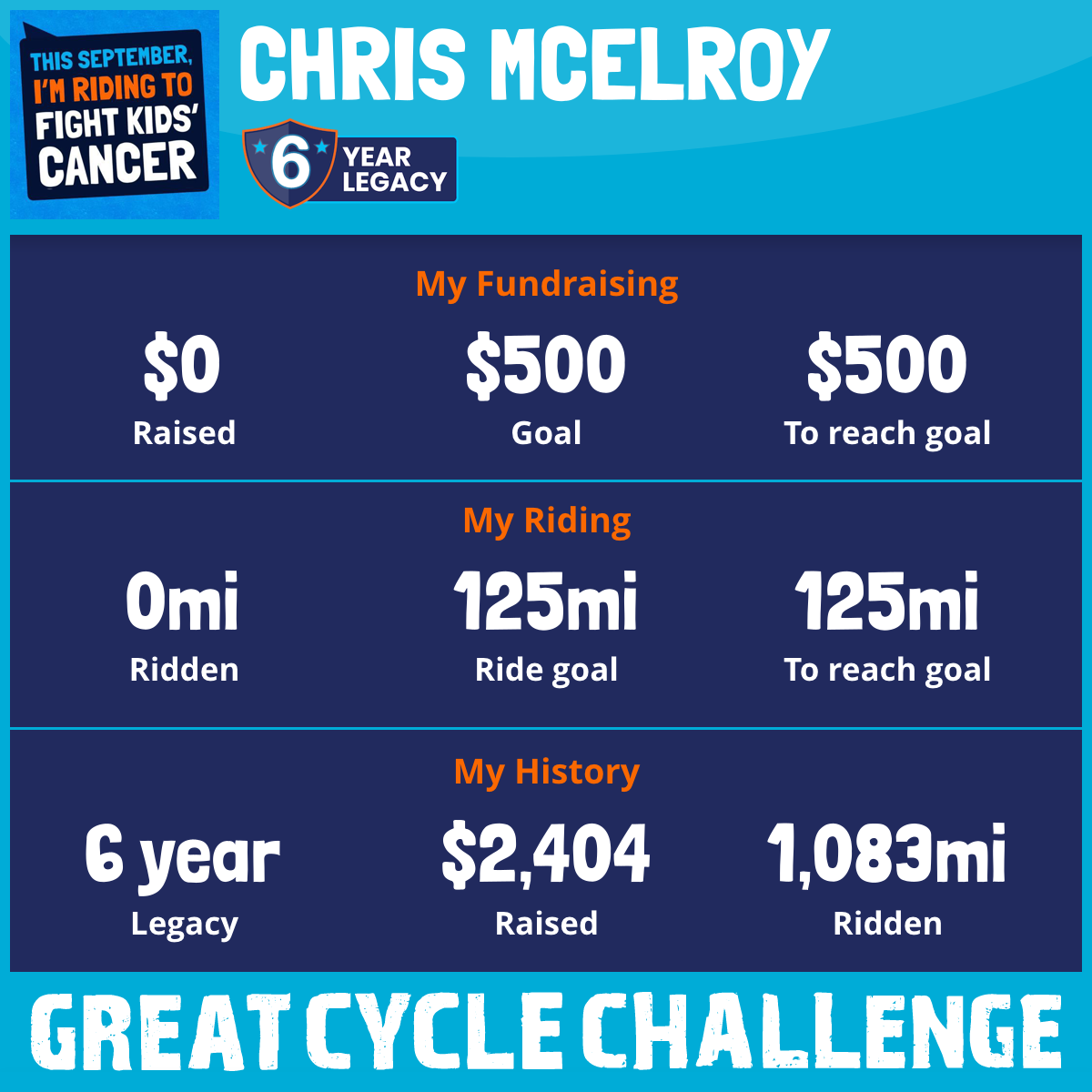I am riding 125 mi for All. Please sponsor me and support my challenge to fight kids' cancer and save little lives.