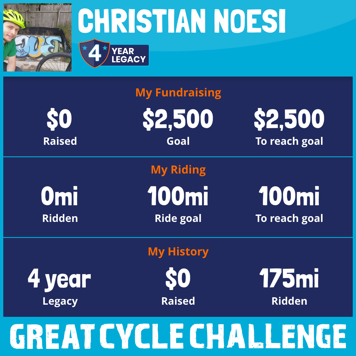 for children with cancer. My goal is to log at least 20, 10+ mile rides and raise $500.
