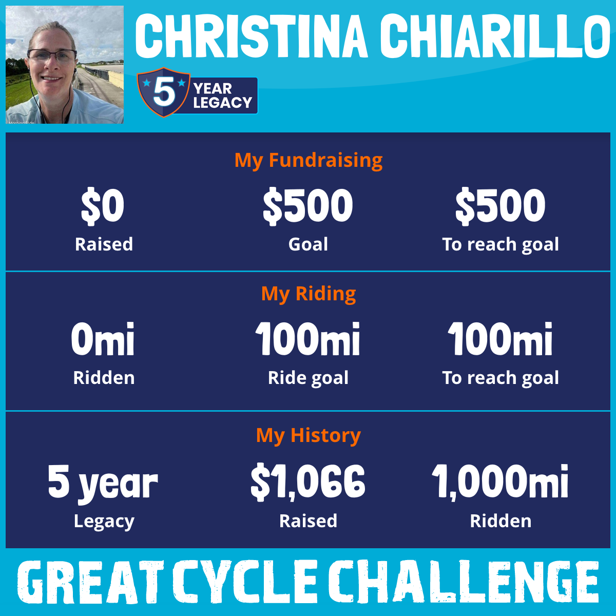 I've been riding in the Great Cycle Challenge for years now. I started as a way to help kids battling cancer, to motivate myself to stay active, and to honor the memory of my uncle—who was bigger than life and taken far too soon. This year, my ride carries even more weight. My sister was recently diagnosed with Stage 4 throat cancer. Watching someone I love face such a brutal illness has shaken me deeply. I can’t imagine what it must be like for a child to go through this. My heart aches for every young life interrupted by cancer—for every family holding on through fear and hope. I’m also healing myself. After a long stretch of illness and a recent surgery that finally gave me the oxygen I’ve been missing, I’m slowly regaining strength. I’m not where I was last year, when I rode nearly 400 miles before an accident cut things short. But I’m here. I’m riding. And I’m doing what I can, the best I can. This year, my goal is 100 miles. It may be shorter, but it’s no less meaningful. Every mile is a prayer. Every ride is a tribute. Every effort is for the kids, for my sister, for my uncle, and for anyone who needs a reminder that healing is possible and hope is real. I ride for love. I ride for life. I ride for them.