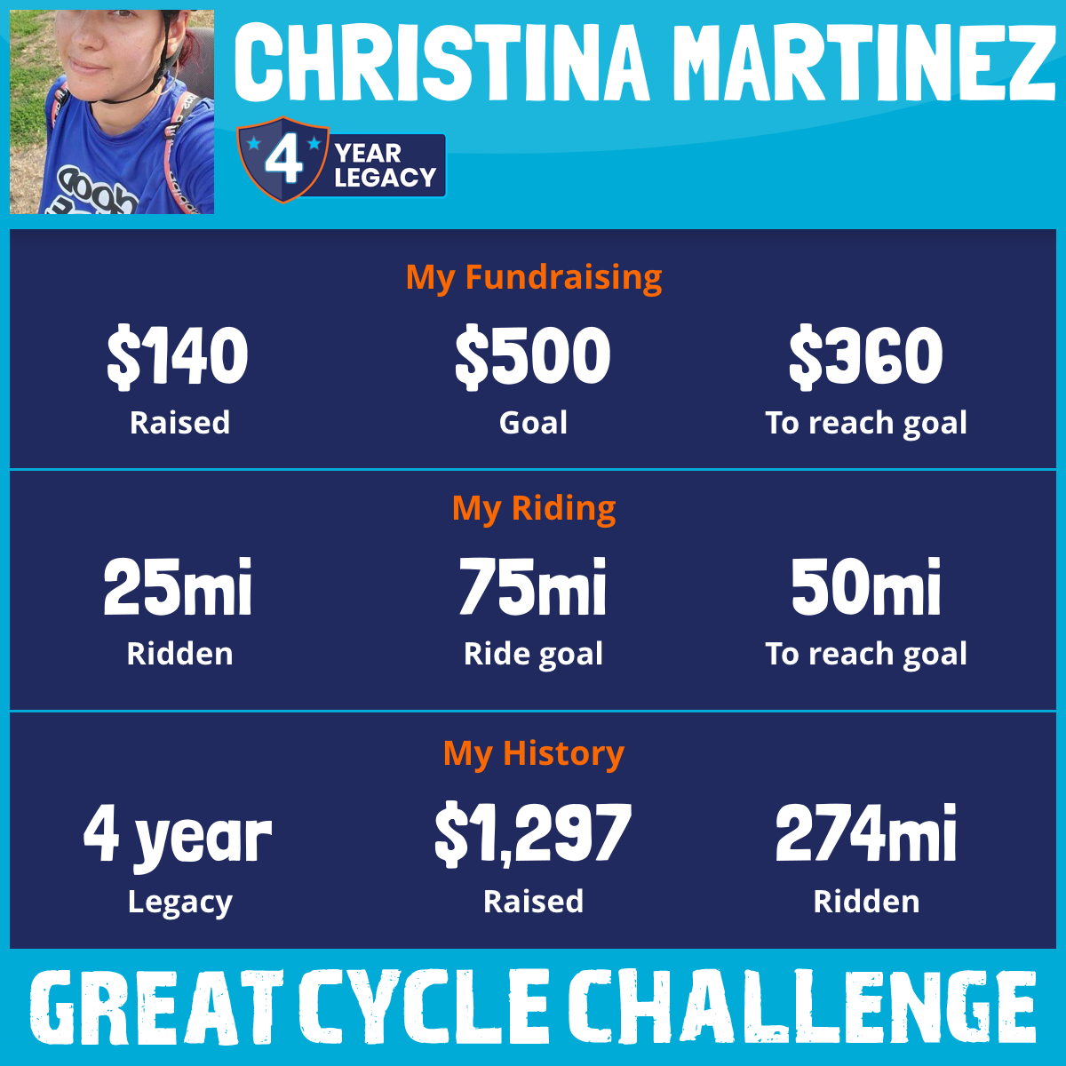 A close friend of mine began this challenge last year. She is a selfless person who is always finding ways to help others. In her kindness, she has inspired me to combine my love for bike riding with a worthy cause of helping children fight cancer.
