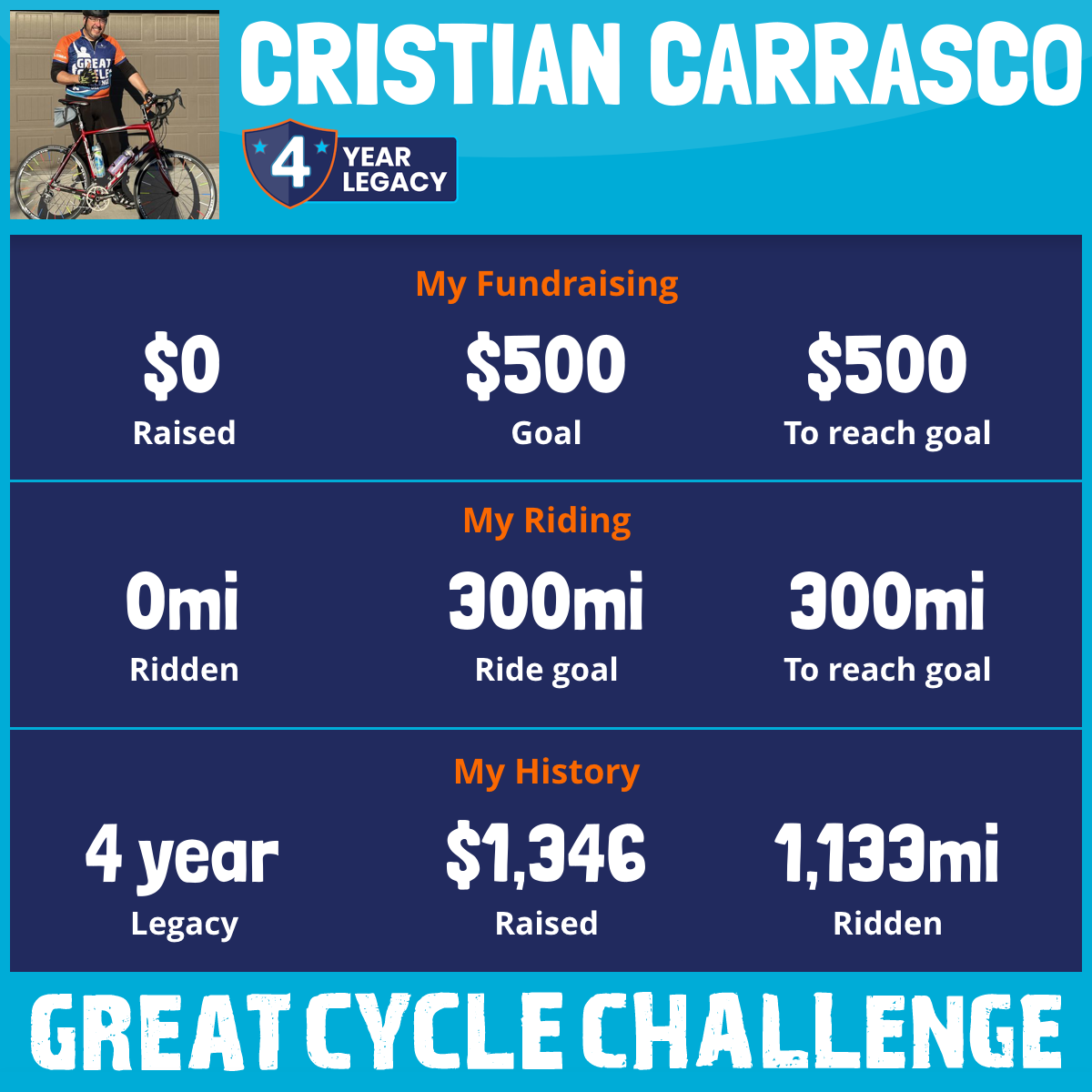 Hi! I am Cristian, teacher for almost 30 years. This September, I am taking part in the Great Cycle Challenge to fight kids' cancer! I am riding for every child who I have not met and my students, now parents, who have kids and are fighting cancer.