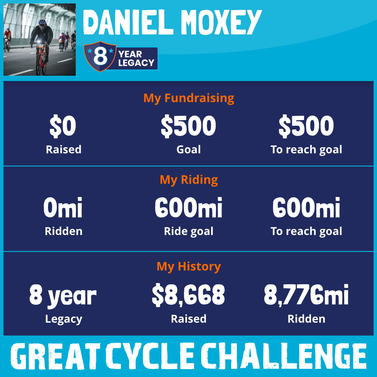 Check out my dashboard :https://greatcyclechallenge.com/Riders/DanielMoxey
