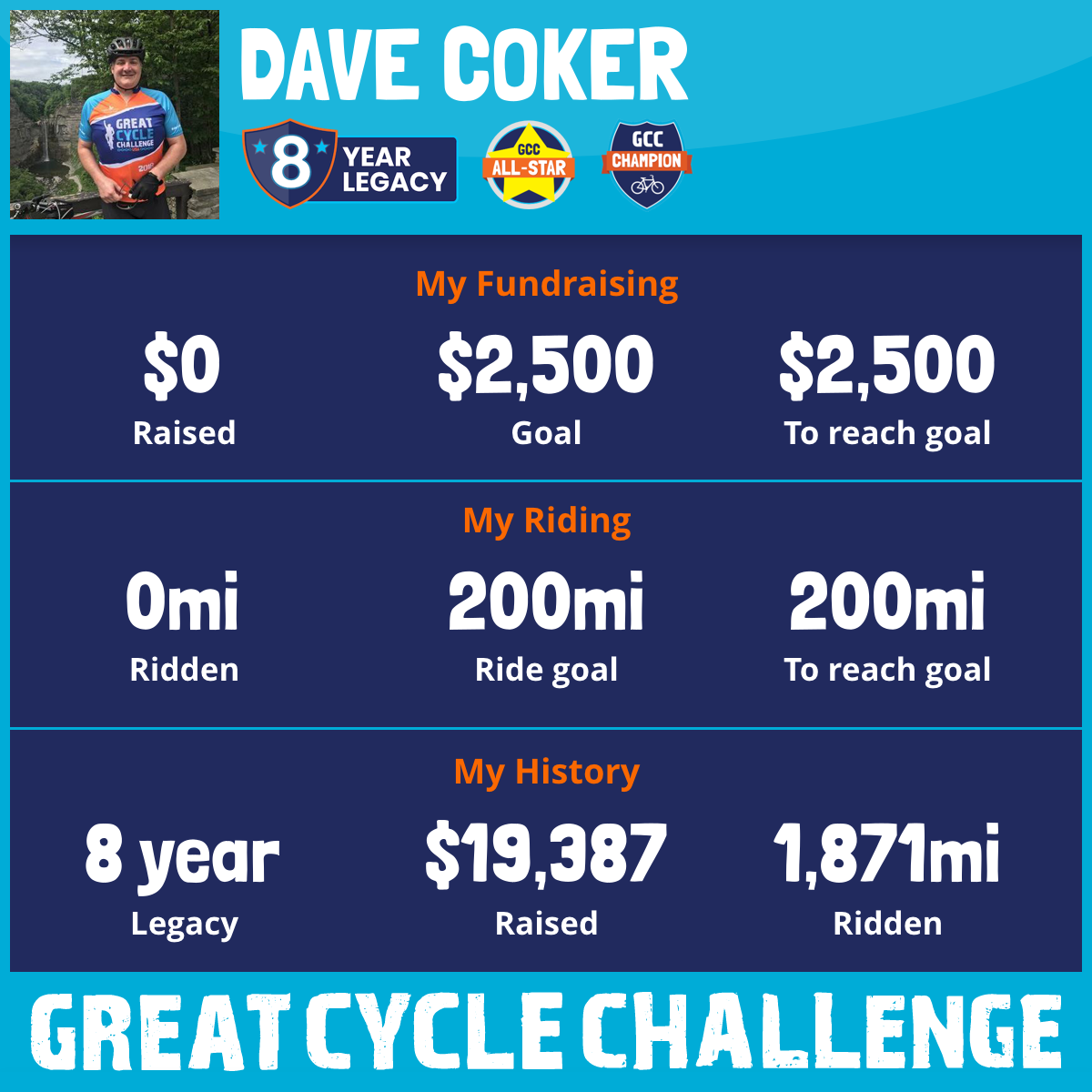 This is my 8th year and just like the last few years, this September 2025 I’m taking part in the Great Cycle Challenge to fight kids' cancer! This year I am going to push to 200 miles and we are going to stretch our financial goal a bit to $2500.
