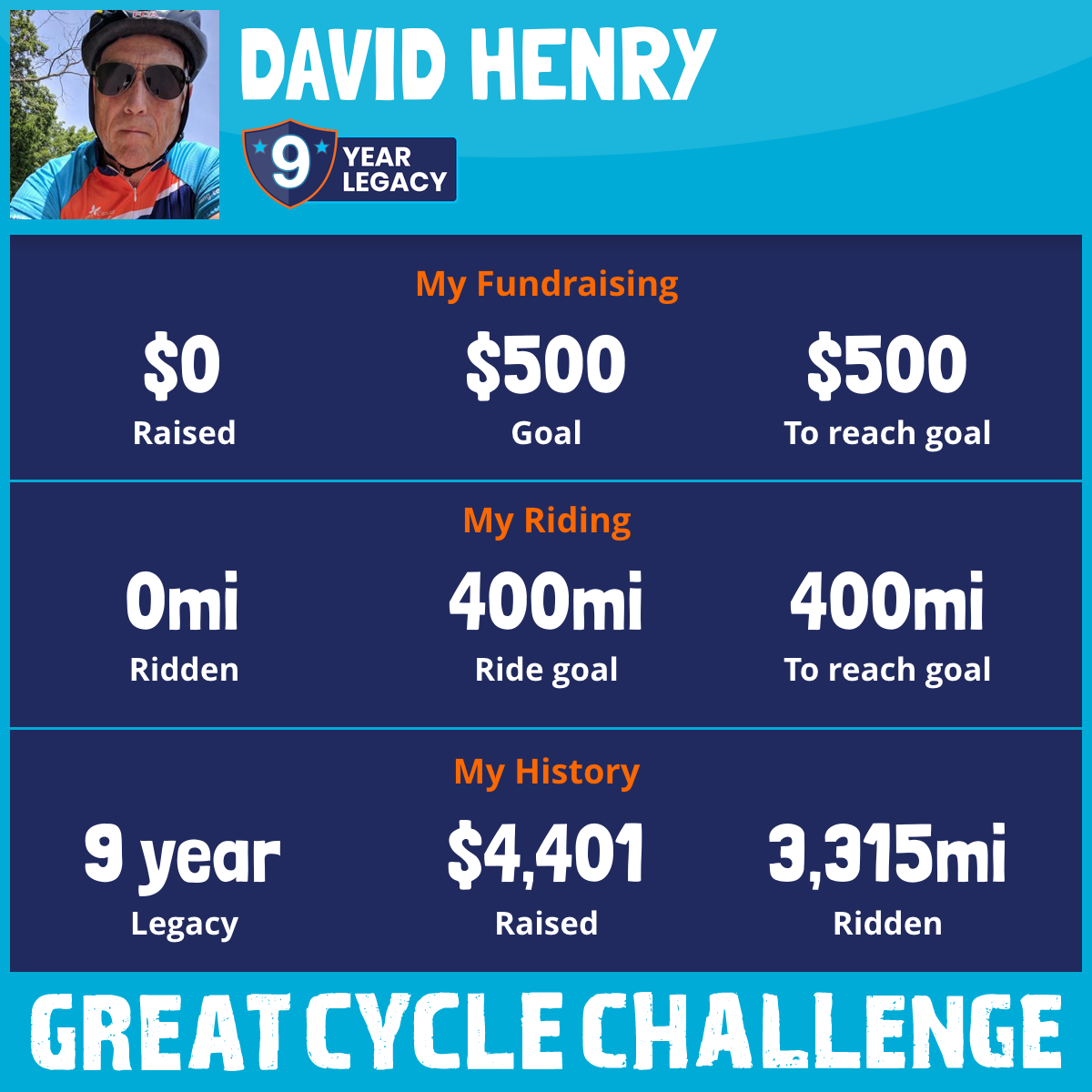 I am riding 400 mi in memory of Robert Graham and Bill Henry. Please sponsor me and support my challenge to fight kids' cancer and save little lives.