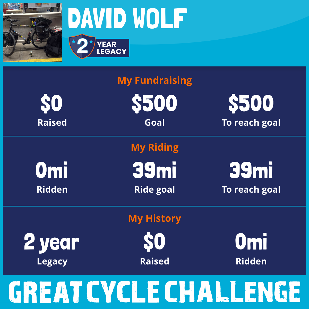 I am riding 39 mi in memory of David Robert Wolf. Please sponsor me and support my challenge to fight kids' cancer and save little lives.