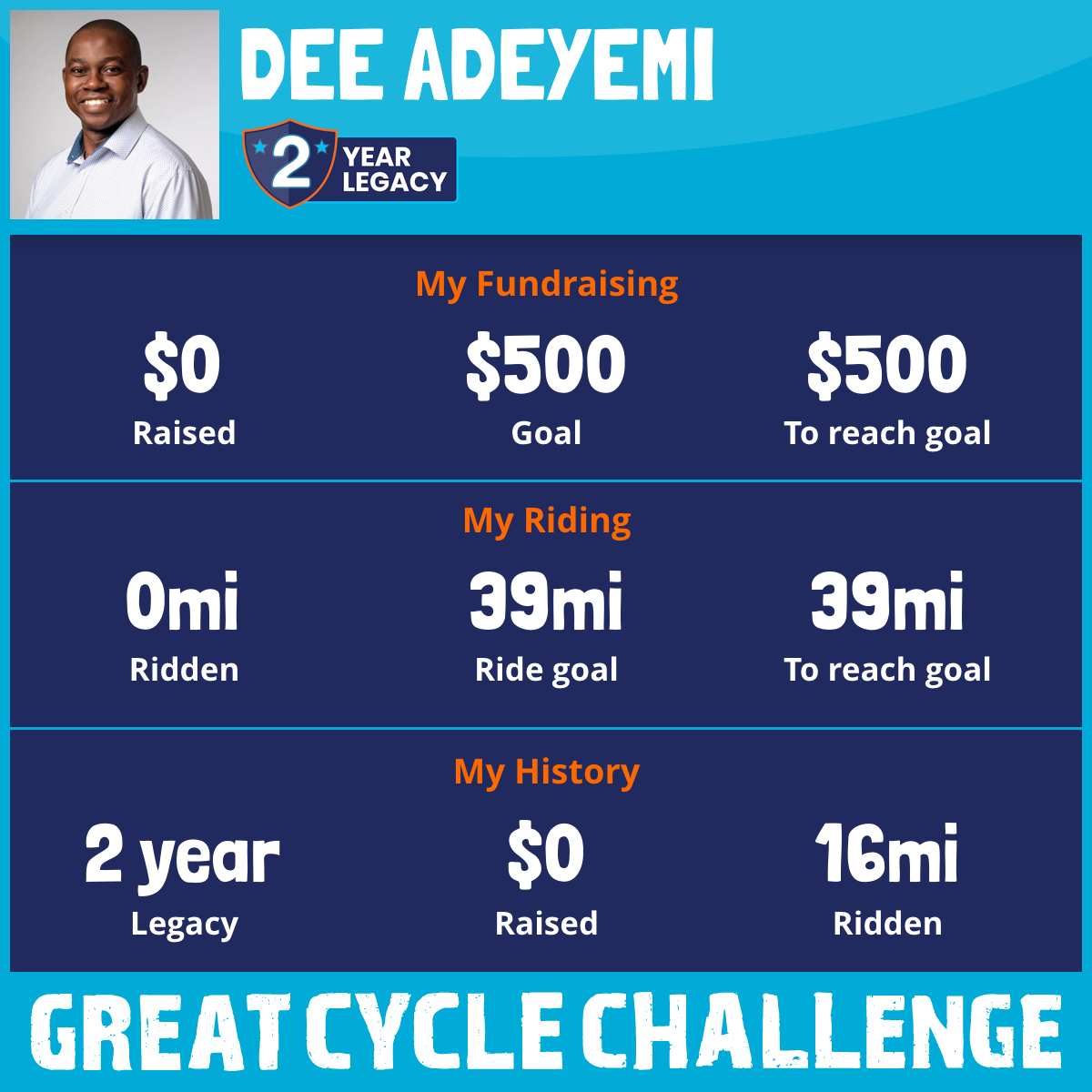 I am riding 39 mi in memory of my dad, Bashir Olumade Adeyemi. Please sponsor me and support my challenge to fight kids' cancer and save little lives.