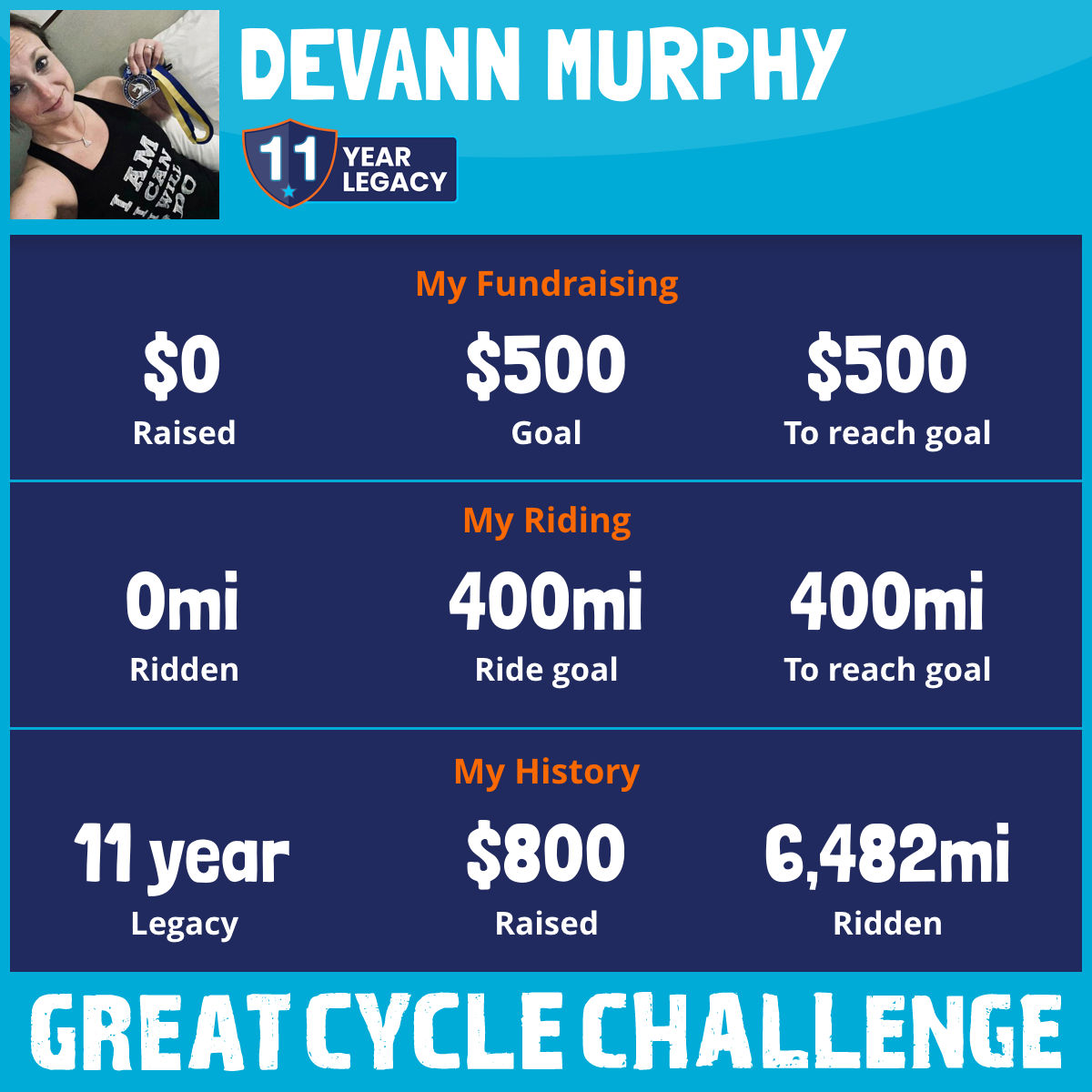 I am riding 400 mi for survivors everywhere. Please sponsor me and support my challenge to fight kids' cancer and save little lives.