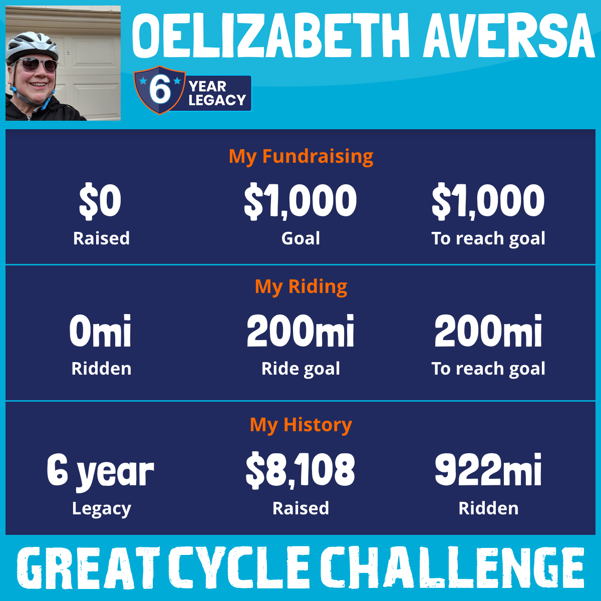 This year you can help me achieve my goal of raising $1900 while riding 200 miles. Please go to my page and click on "Donate Now." Here's the link: https://greatcyclechallenge.com/Riders/ElizabethAversa