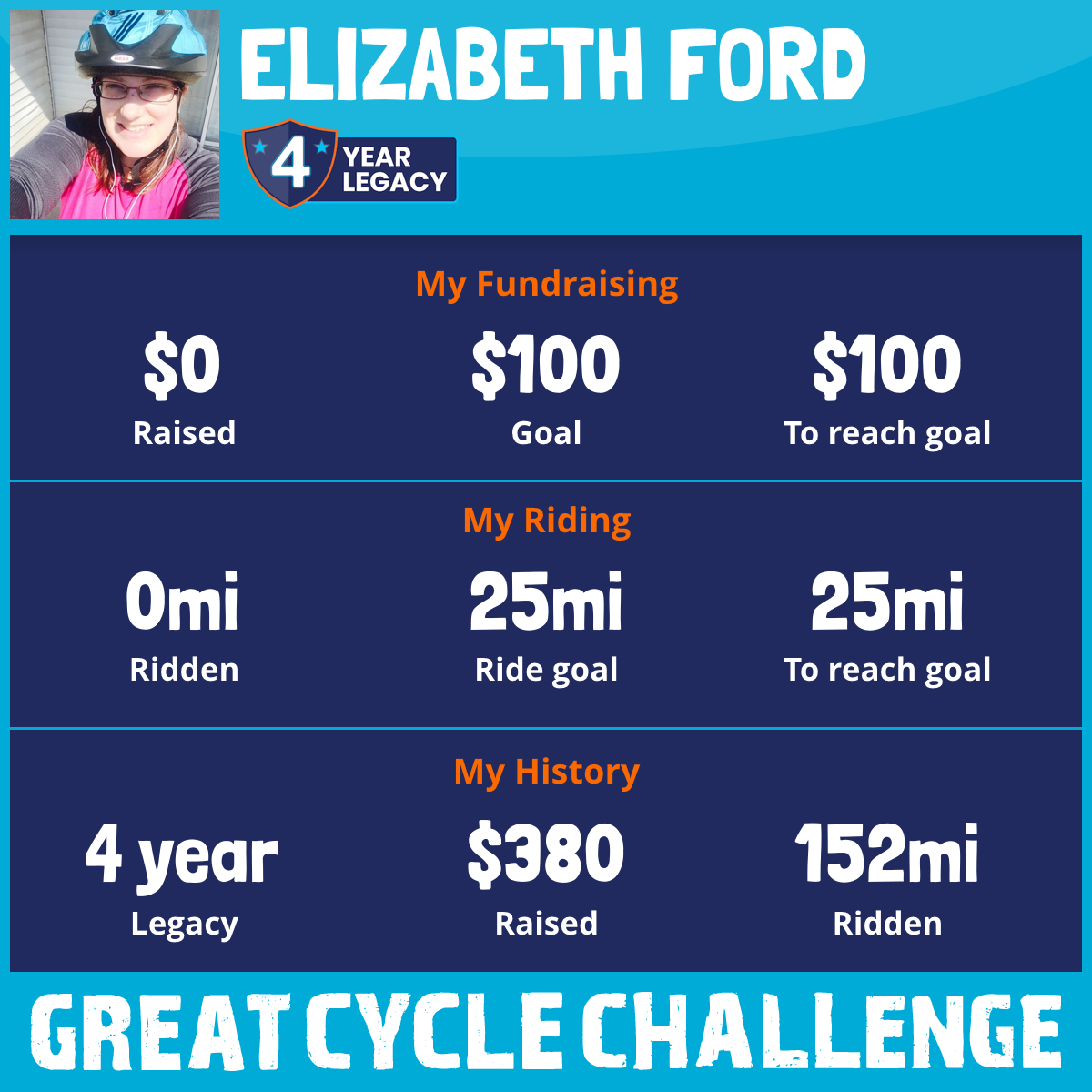 I am riding 25 mi for Mary Ford. Please sponsor me and support my challenge to fight kids' cancer and save little lives.