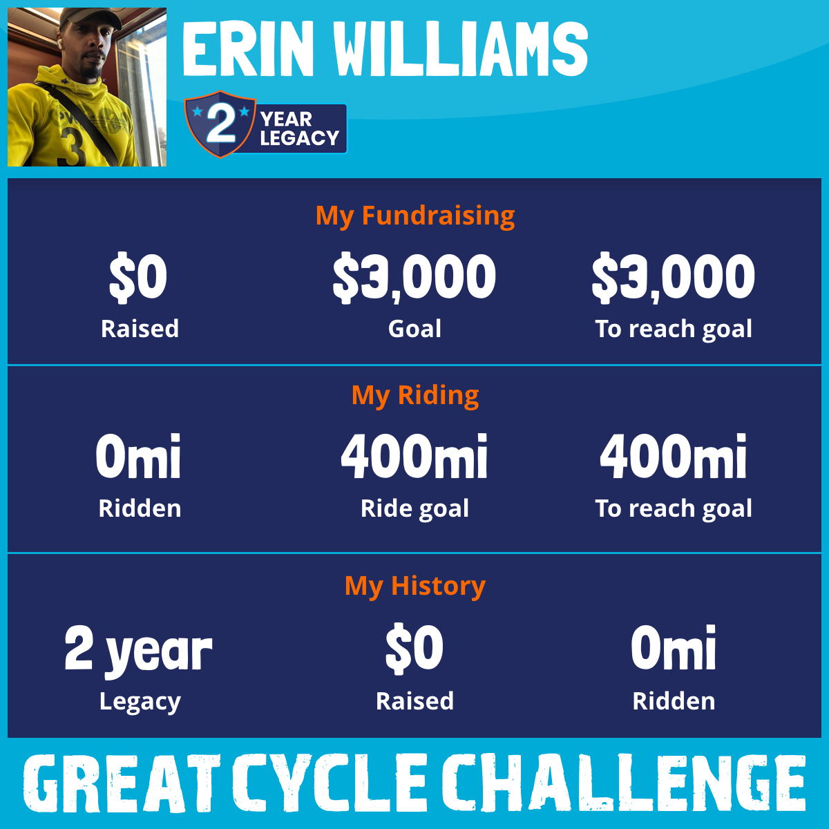 I am riding 400 mi in memory of my grandfather, Erik Lamar Williams I. Please sponsor me and support my challenge to fight kids' cancer and save little lives.