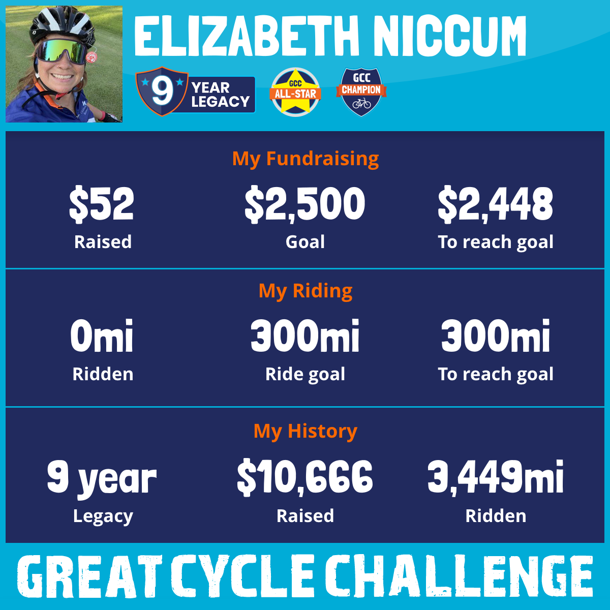 I have been part of the Great Cycle Challenge community since the beginning in 2015. However, due to health issues this is my 8th year physically participating.