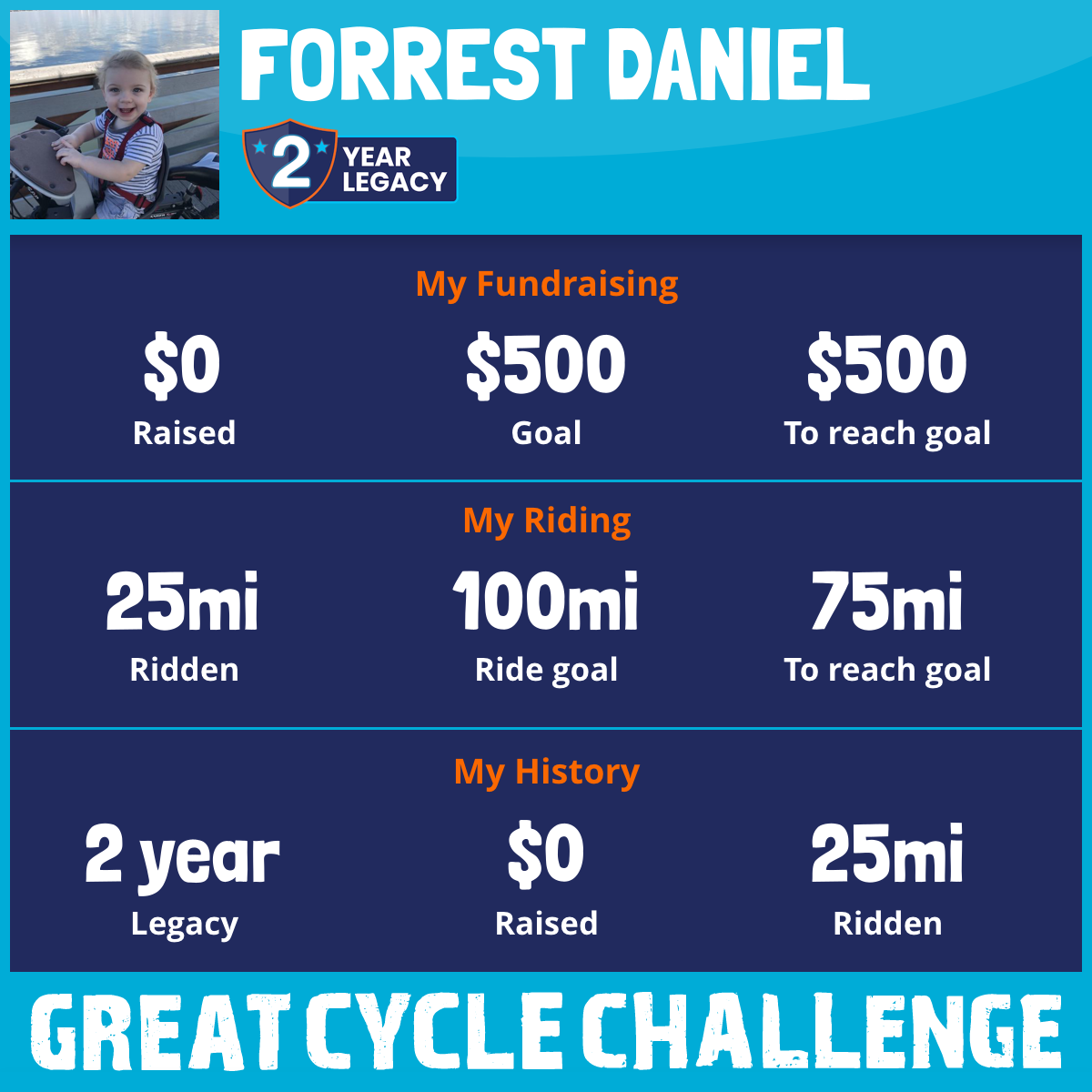 I am riding 100 mi for my son, Mason. Please sponsor me and support my challenge to fight kids' cancer and save little lives.
