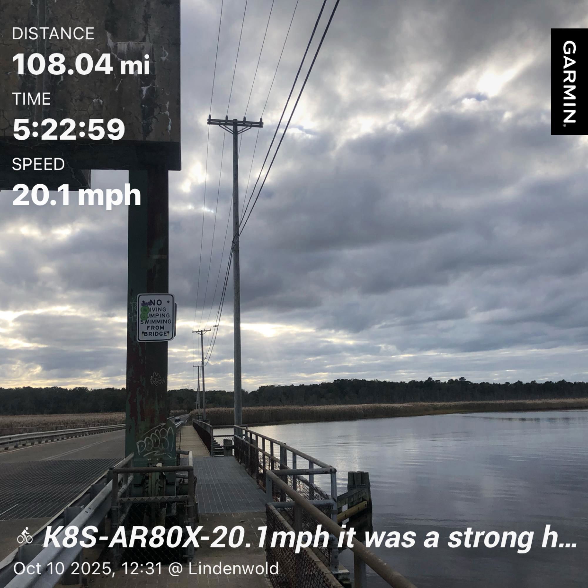 108.0 mi ride - K8S-AR80X-20.1mph it was a strong headwind whole ride 15-20mph ENE - Friday, October 10, 2025