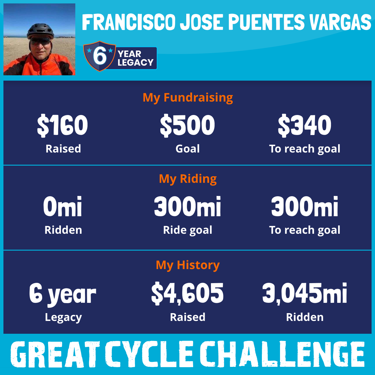 I am riding 300 mi in memory of Francisco Puentes Centeno. Please sponsor me and support my challenge to fight kids' cancer and save little lives.
