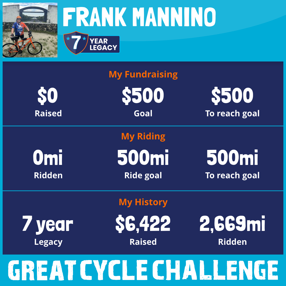 I have done this right before last year the great cycle challenge and I am going to do it this year but I won’t start until September 1 through September 30 so please donations at that time