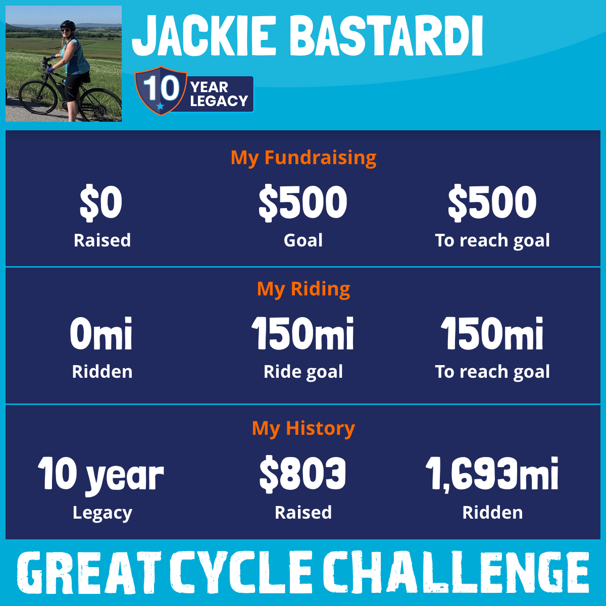 I ride in honor of my grandma, Kay Bastardi. She was one of the most generous and kind women I have ever known. She was one of the strongest people I've ever met, and fought leukemia and heart disease. I ride because she believed in helping others, especially children. I hope to carry on her mission to help as many people as I can through charity and volunteer work.