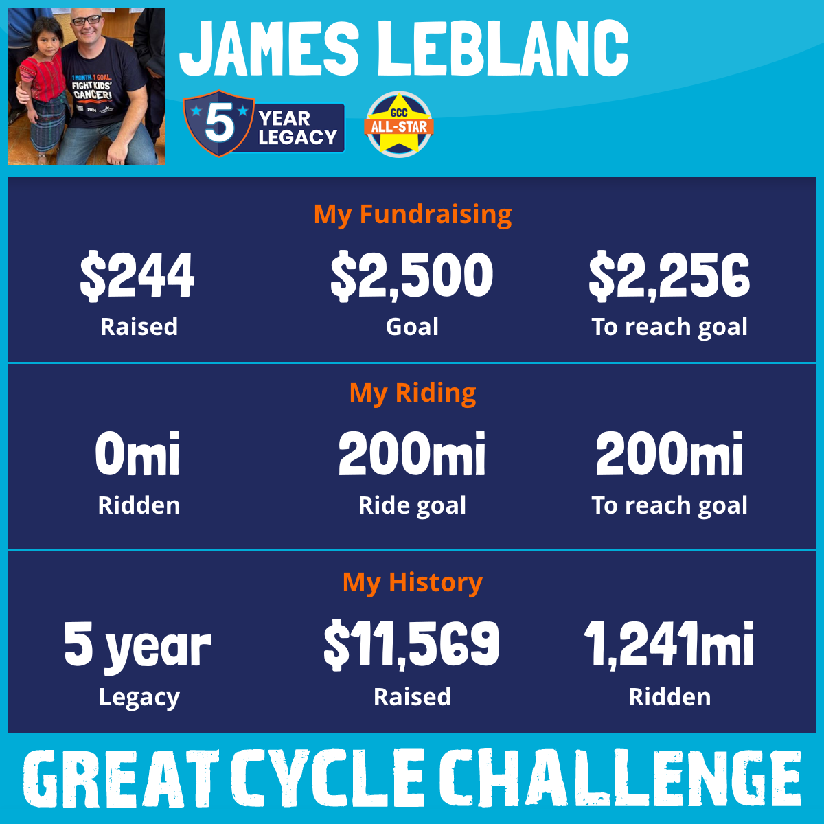 For the 5th year in a row, I am taking part in the Great Cycle Challenge to fight kids' cancer!