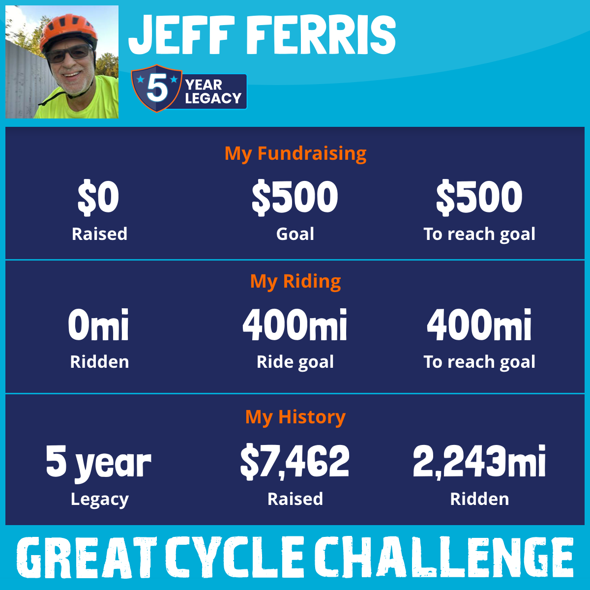 Jim fought a long, brave battle against this terrible disease. Through it all he remained an ardent supporter of the Great Cycle Challenge, riding for the kids and encouraging others to do the same. I miss my dear friend and ride every mile in his memory.