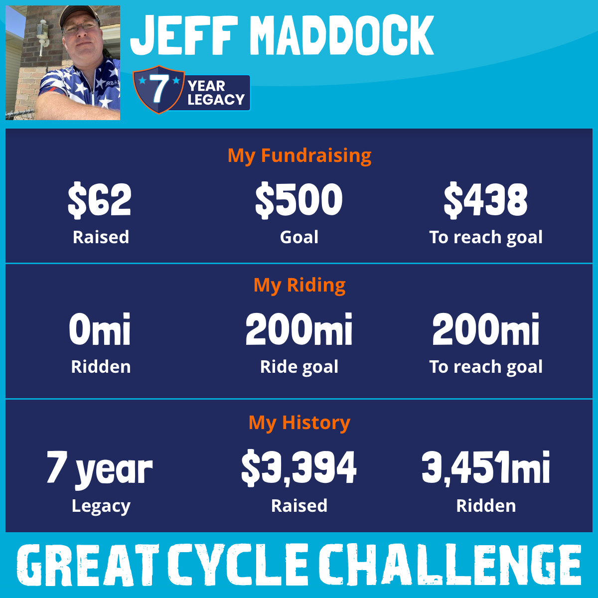 I am riding 200 mi for Jeff Maddock. Please sponsor me and support my challenge to fight kids' cancer and save little lives.