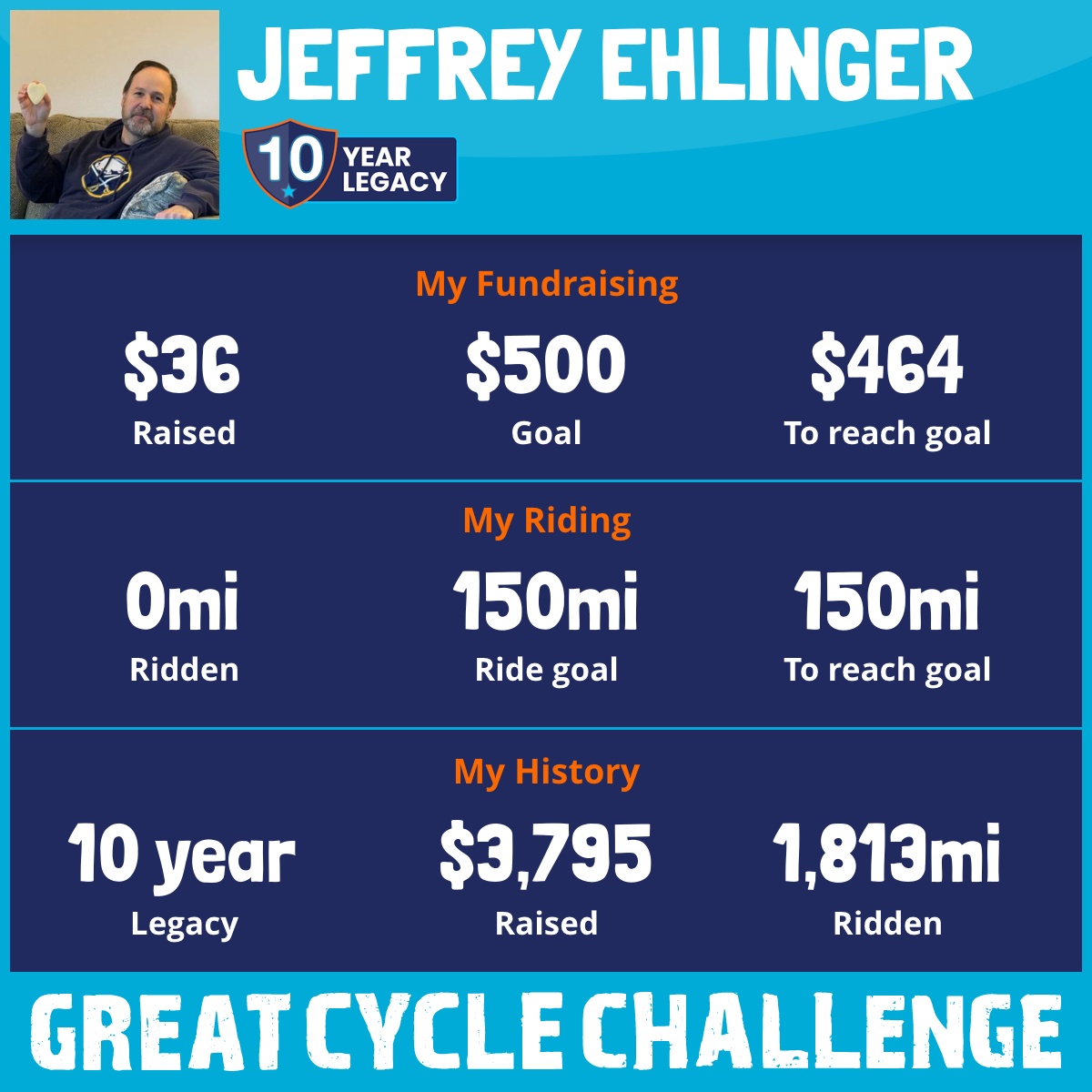 In September 2025 I will once again take part in the Great Cycle Challenge to fight kids' cancer... Why? Because cancer is the biggest killer of children from disease in the US. Sadly, over 15,000 children are diagnosed every year. Please support my ride by making a donation to GACC. Your support will change young lives. Thank you.