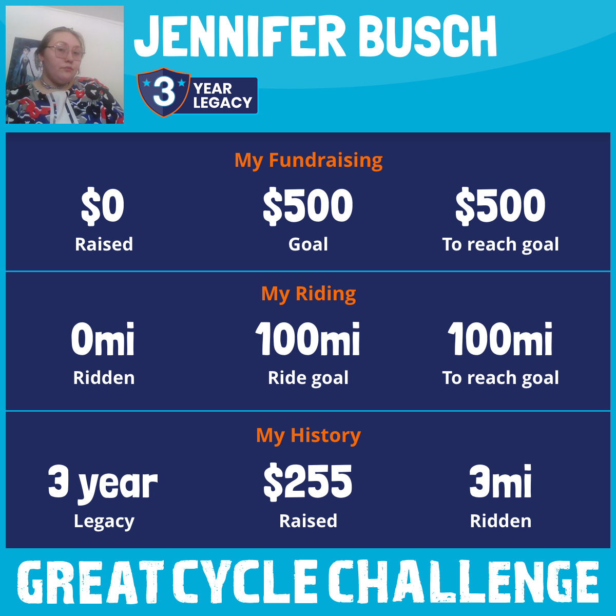 I've raised $0 My goal is $500 Donate Now