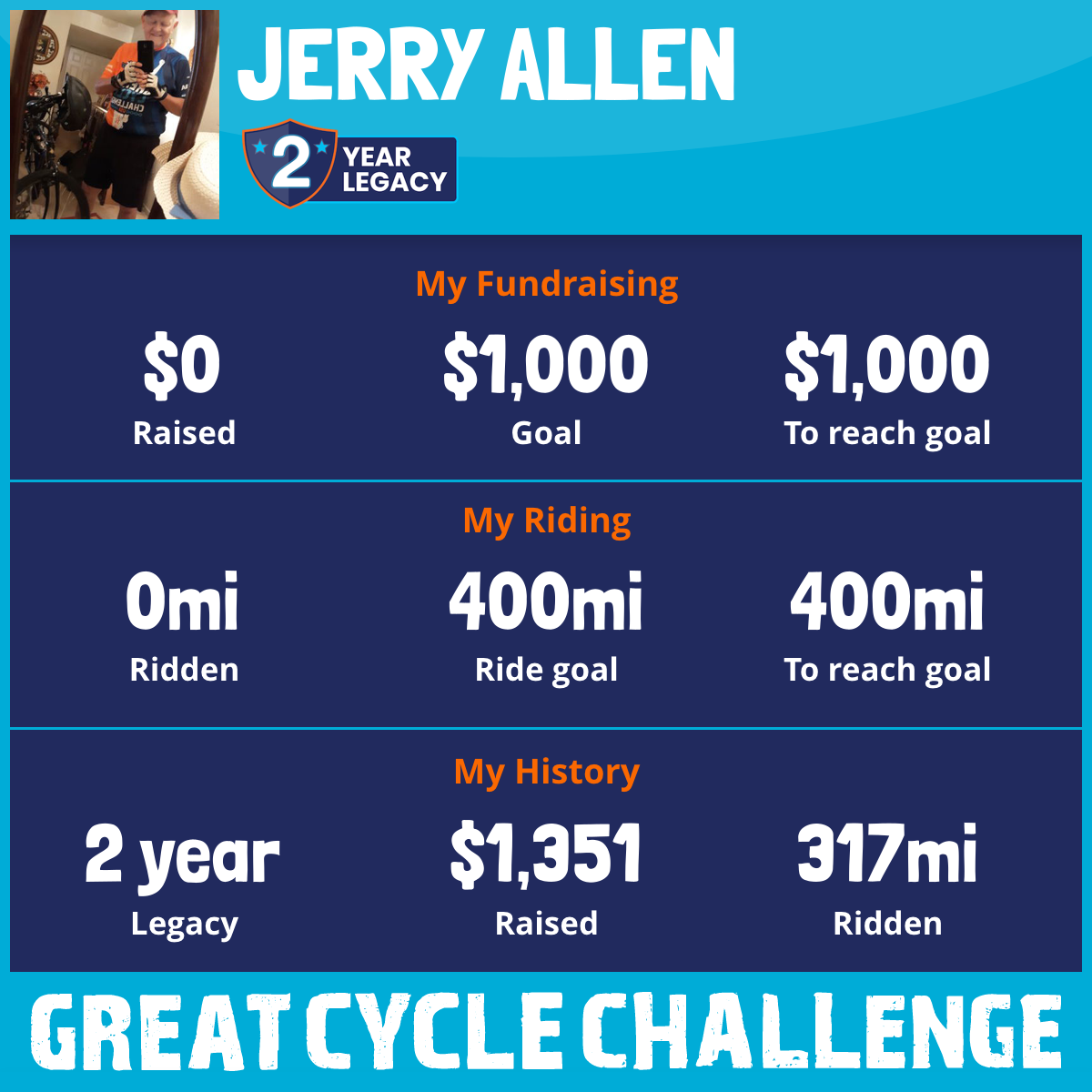 I am riding 400 mi for Unicycle Jerry !. Please sponsor me and support my challenge to fight kids' cancer and save little lives.