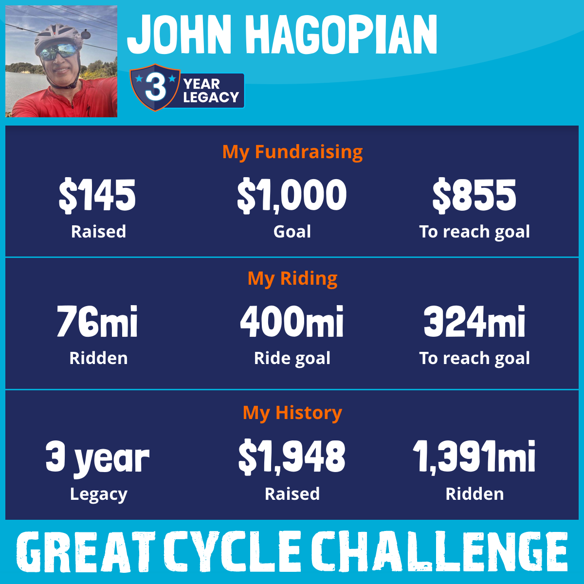 Last year I rode 650 miles and we raised $1246. Unfortunately, I can't commit to that level again because I over taxed my hip replacement and took several months to rehabilitate it. So I am lowering my goal to 200 miles and see where it goes from there.