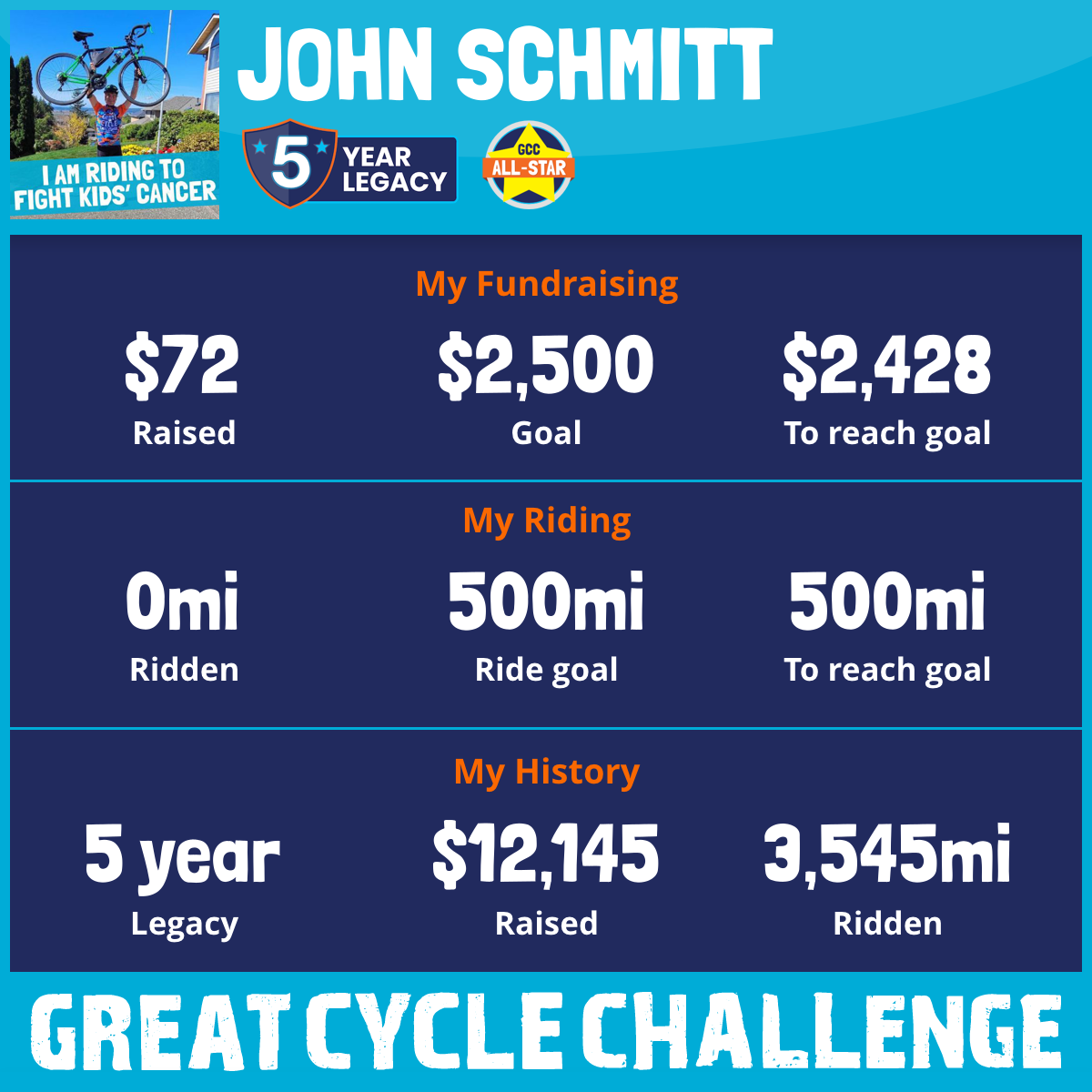 This September, I will participate in my fifth Great Cycle Challenge to fight kids' cancer. I will be riding in memory of my brother-in-law, Matt Fliger, who passed away from brain cancer at a young age. I plan to ride 300 miles during the month and hope to raise $3000 to to help fight childhood cancers. Your generous donations to the Children’s Cancer Research Fund are greatly appreciated and will make a difference to these kids!