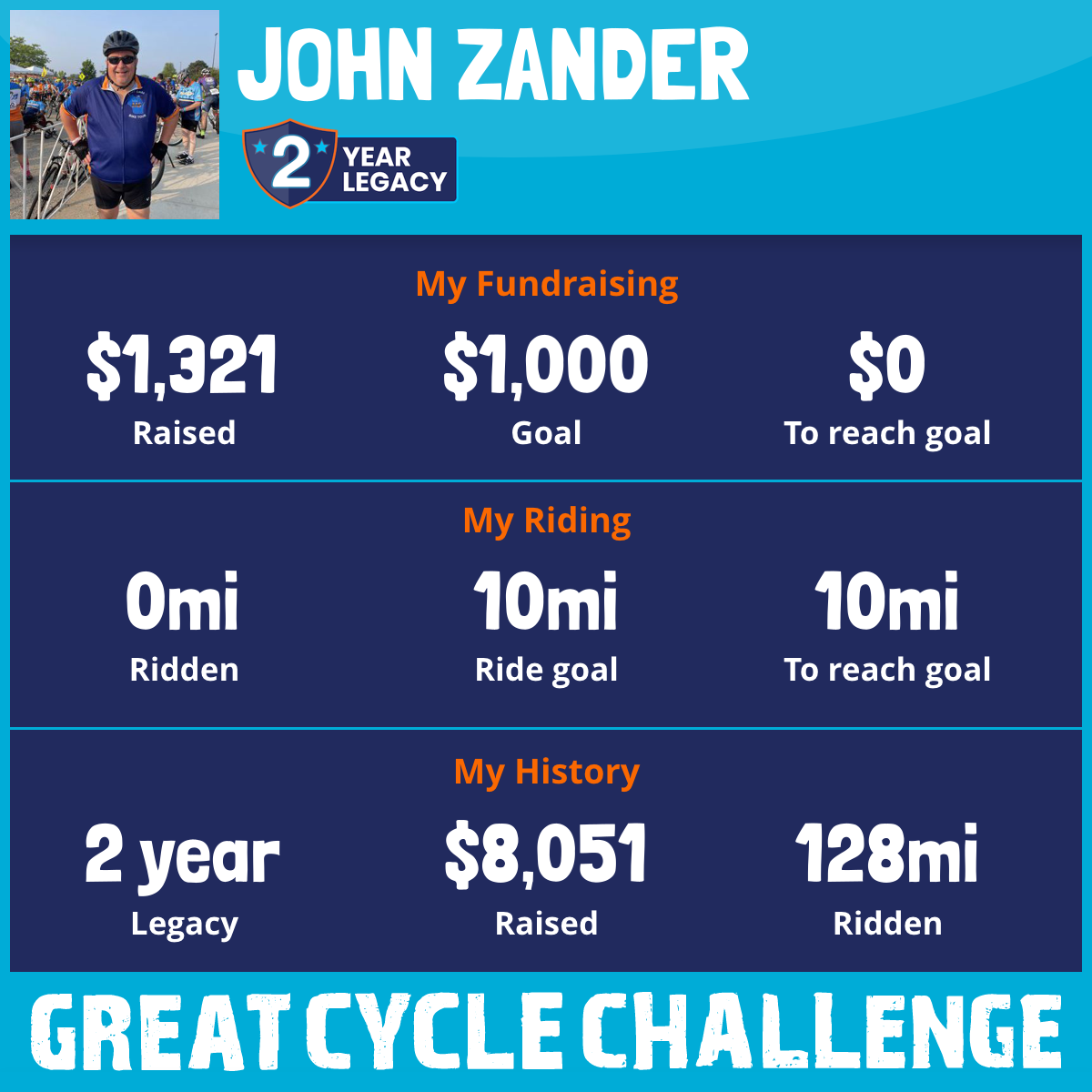 This September, I am taking part in the Great Cycle Challenge to fight kids' cancer! But as you can see I only pledged to ride 10 miles. Why you might ask? Well this spring I had a reoccurrence of my prostate cancer. September 2 will be my last of 39 radiation treatments plus, I’m also doing hormone and therapy. Between the two of them, my energy level is in the basement along with other side effects. However, I hope to be back on my bike towards the end of September.