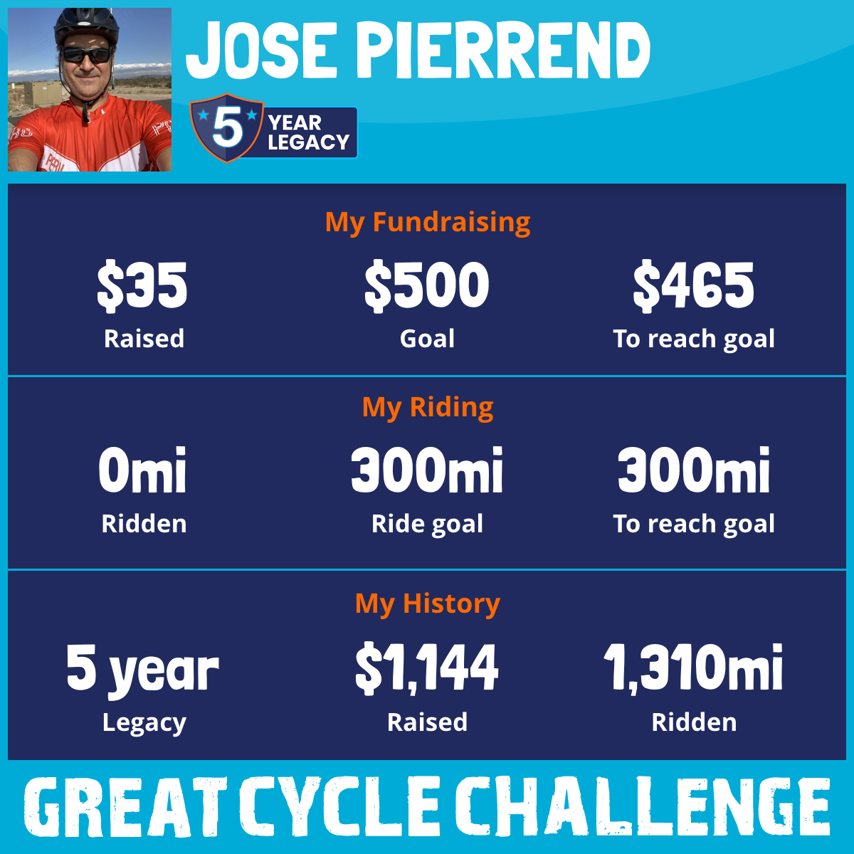 I am riding 300 mi for my dad, Luis Pierrend. Please sponsor me and support my challenge to fight kids' cancer and save little lives.