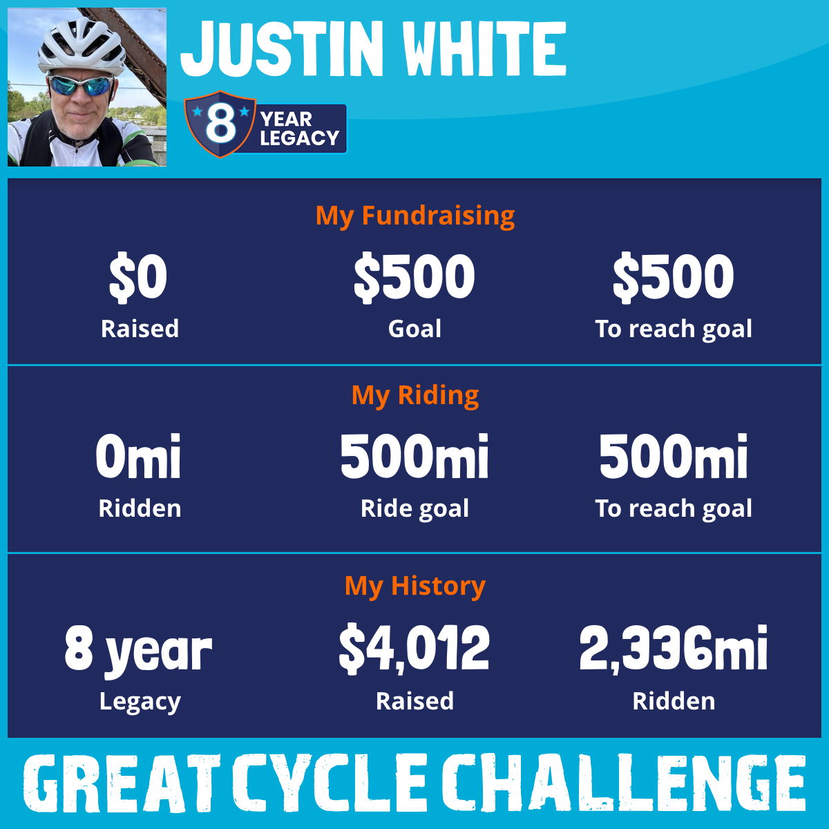 Dad, I am riding to reach my goal in your honor. You are doing everything you can to fight this deadly disease. With my efforts to raise money, I hope to give cancer survivors like you a fighting chance. Your son, Justin