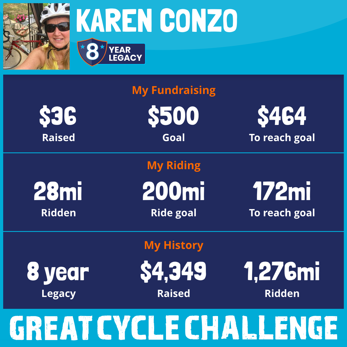 When I started this 8yrs ago, I rode in honor of a young boy named Keegan Tuma, who has battled cancer since he was a baby. He is now 18 and continues to battle and, despite the occasional setbacks, engages in his love of cooking, making meals for his family, especially for his mom, who is battling her own medical challenges. I then added my dad, Robert L. Wright, in memoriam. He was my best friend, golf coach, and "all around good-guy." Despite being given only 3yrs at the time of his diagnosis, he went on to make orchid lovers out of people in Winter Park, FL, sing to his dog, and have martinis with his wife for 8yrs. Lastly, with sorrow 2 years ago, I added my father-in-law, Nicholas F Conzo, to my "riding for" page. He stepped into the "dad" role just 6months after my dad passed and had the joy of the Pop Pop role too. He had a profound impact on many people across various walks of life. It is because of these 3 gentlemen, as well as all of the people, especially children, who bravely fight and never give up, that I ride.