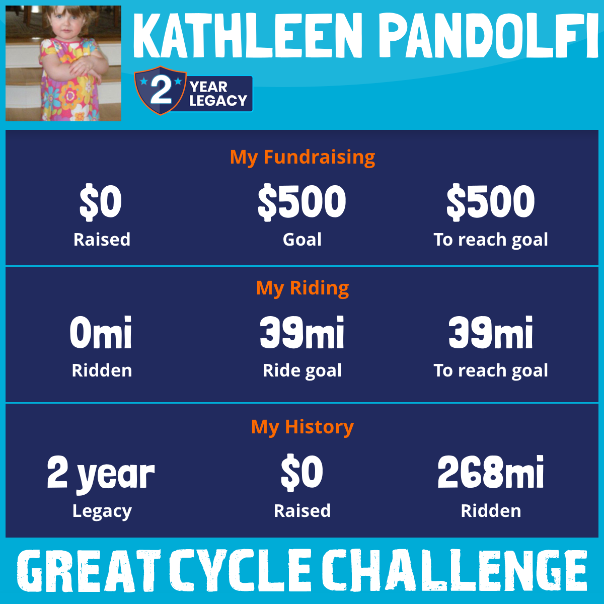 I am riding 39 mi in memory of my loved one, Kathleen Pandolfi. Please sponsor me and support my challenge to fight kids' cancer and save little lives.