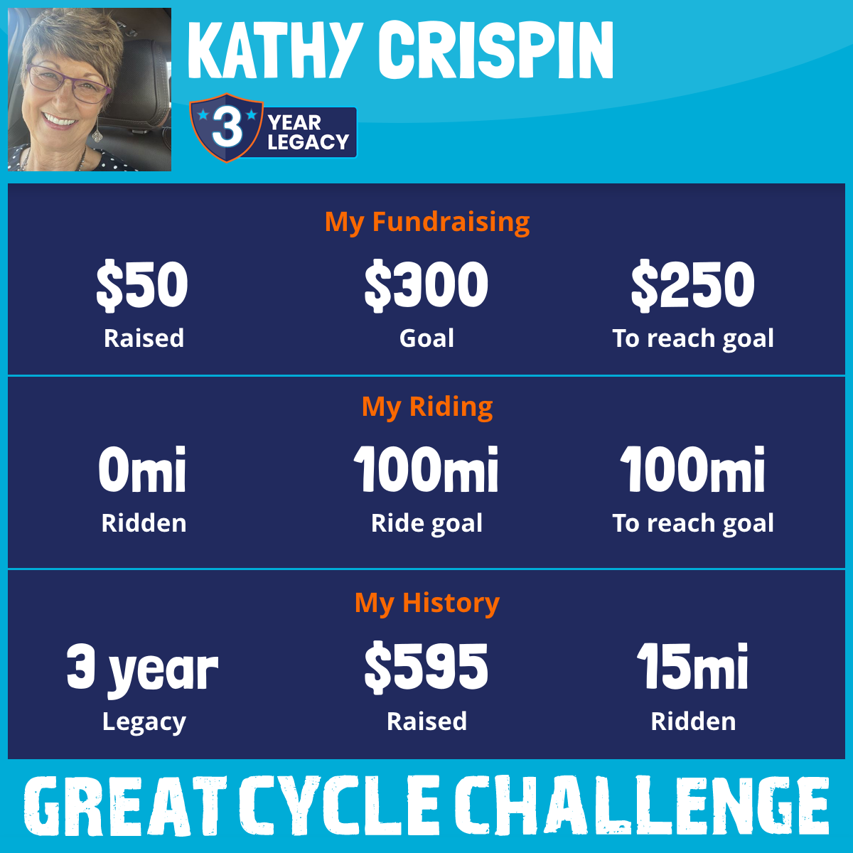 This year I want to build a Team that will join me in this challenge of riding 200 miles and raise $500 during the month of September. I want to honor my gdaughter, Scout. Since 2018, She has battled THREE CANCERS. At age 10, she lost her leg to Ewing Sarcoma. At 12, she faced Kidney Cancer. At 14, her third cancer, which was a brain tumor. Scout has been recovering from her knee surgery on May 21, 2024. Once it looked like things were getting better, the amount of pain she was in seemed to wake up other pain and that was the next three weeks. Since 2018, she has been through so much! Please pray she has enough energy to have a fun summer! Scout is my brave hero and I’m proud to be her NaNa.