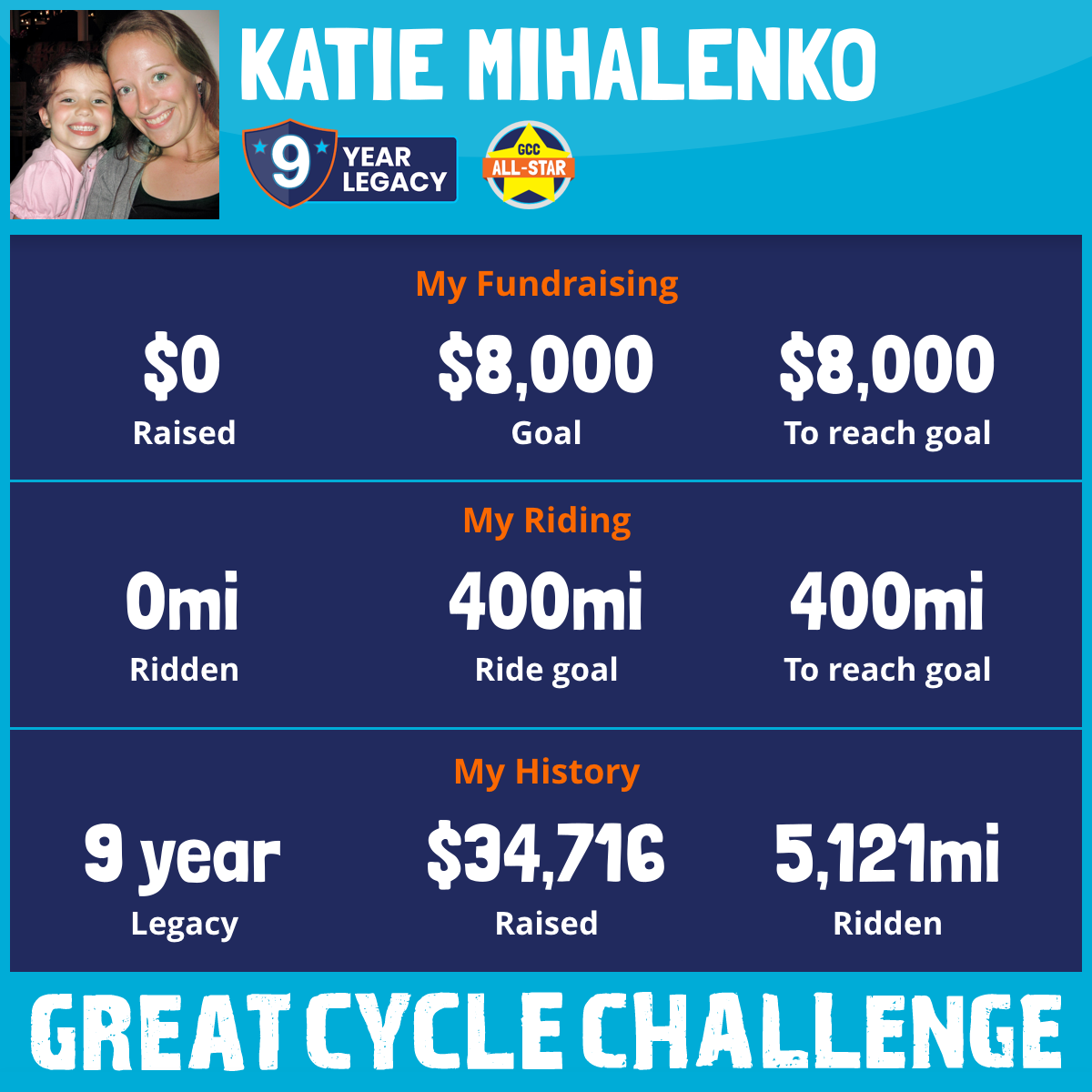In 2012, my family had to say goodbye to Lizzy, my 9-year old niece, after a brave battle against brain cancer. This is my 9th year participating in the Great Cycle Challenge. This year my goal is to bike 400 miles and raise $8,000 towards conquering childhood cancer. Follow my story, sponsor me, donate to support research to find a cure, bike along with me, and/or share awareness. <3 Don't worry, be happy :)