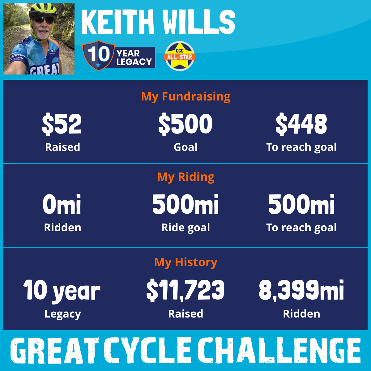 This September, I am taking part in the Great Cycle Challenge to fight kids' cancer! This will be my 10th year riding in the Challenge. It is my pledge to ride my bicycle at least 500 miles in the month of September, yes 500 miles and raise as much money as I can for the kids.